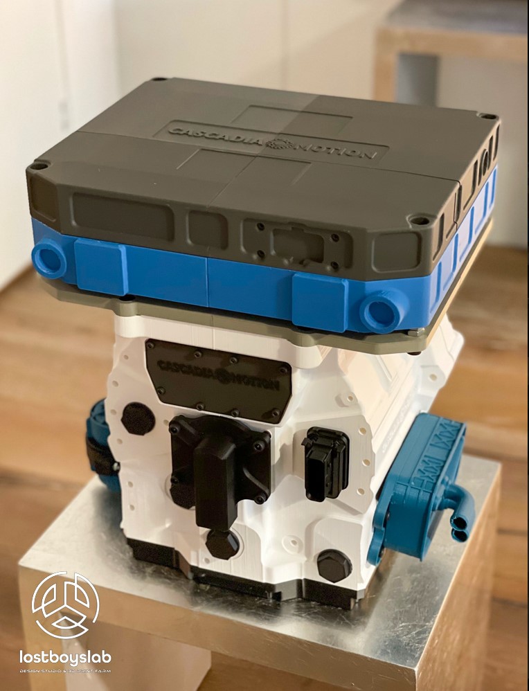 Enter our meticulously 3D printed Cascadia engine, a true marvel of modern engineering, rendered in over 30 distinct parts. Complementing this is the BorgWarner gearbox, split into three detailed components. While most elements have been materialized using recycled PLA, certain crucial components benefit from the robust ONYX material printed on our advanced Markforged machines.